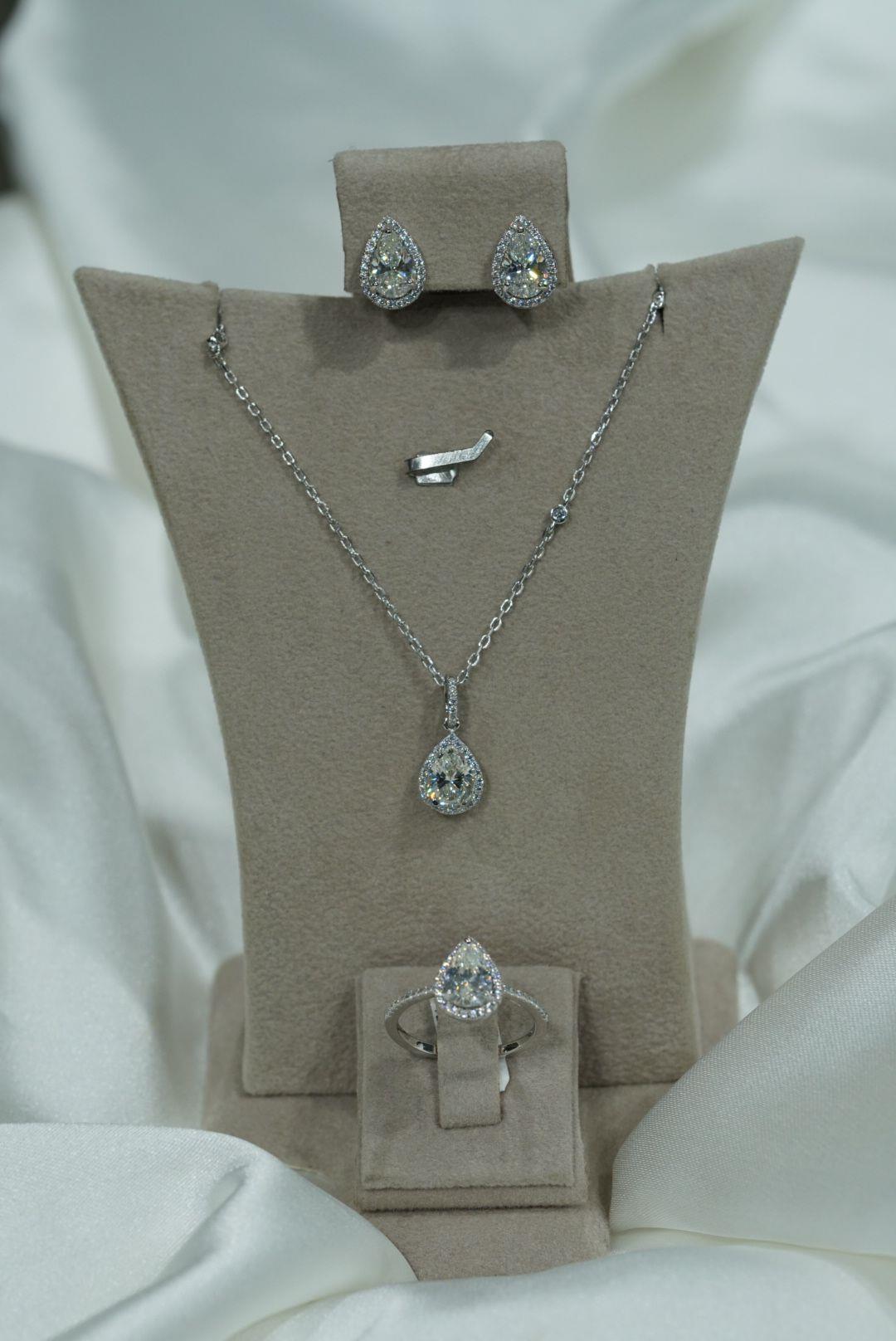 Zarafetin damla formunda hayat bulduğu eşsiz bir tasarım. Işıltılı Mozanit taşların ışıltısı ve klasik hatlarıyla her stile uyum sağlayan özel bir takım.