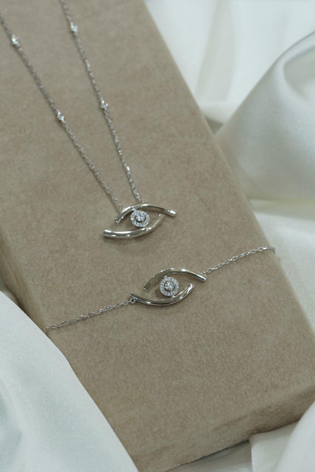 öz Kolye & Bileklik Takımı, koruyucu sembolizmi minimalist bir çizgide yeniden yorumluyor. Pırlanta formunda taş detaylarıyla hareket kazanan göz sembolü, hem kolyede hem bileklikte ışığı zarif biçimde yansıtır.