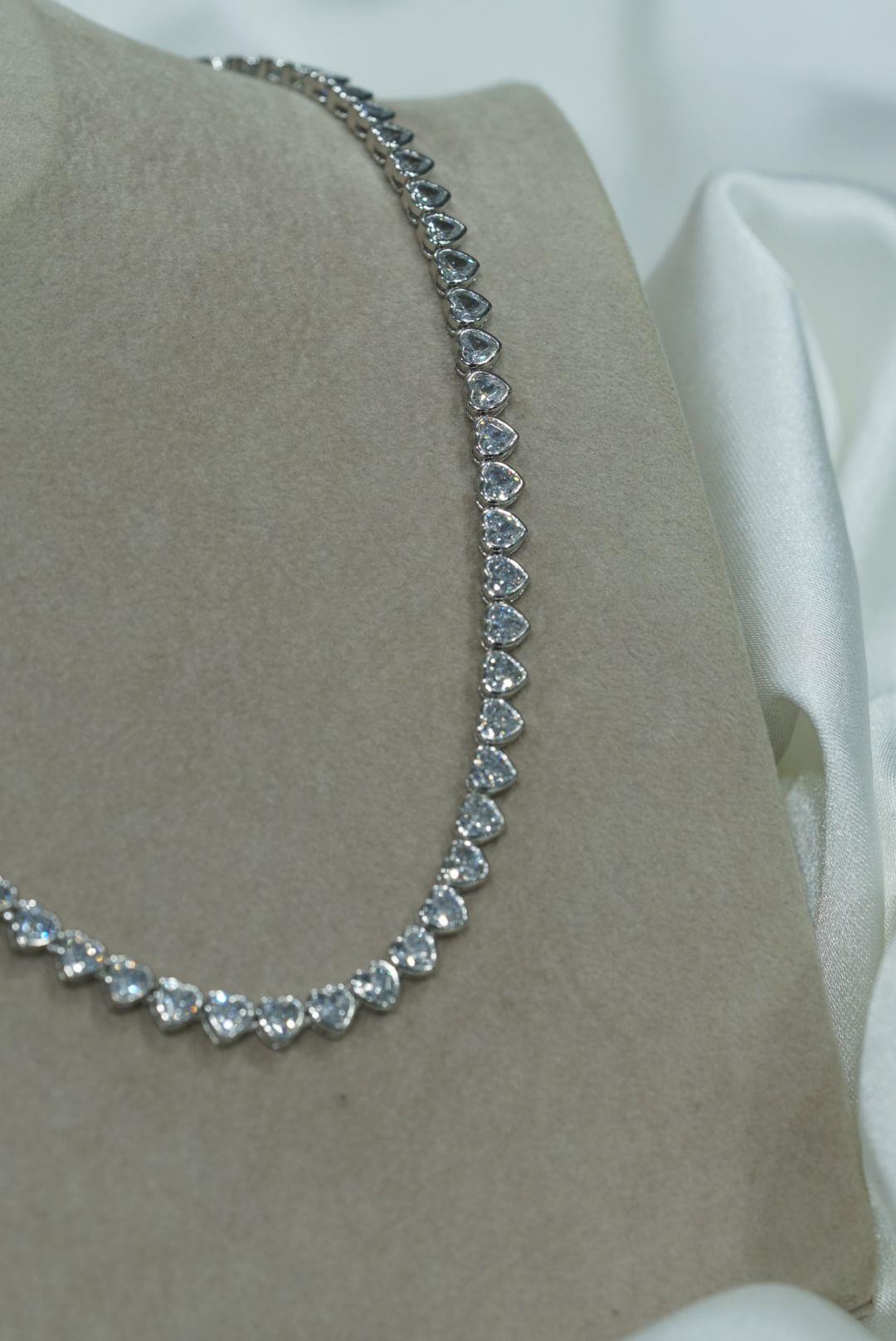 Aşkın en zarif hali. Kalp kesim taşların su yolu dizilimiyle birleştiği bu kolye, ışığı her hareketinde büyüleyici bir şekilde yansıtır.